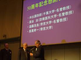 次に50周年を記念して,これまで本学会に多大なご尽力をされて来られました4名の先生方(千葉大学名誉教授・井出源四郎先生,防衛医科大学名誉教授・高谷 治先生,帝京大学名誉教授・遠藤浩良先生,帝京大学・長尾孝一先生)に感謝状が贈呈されました。